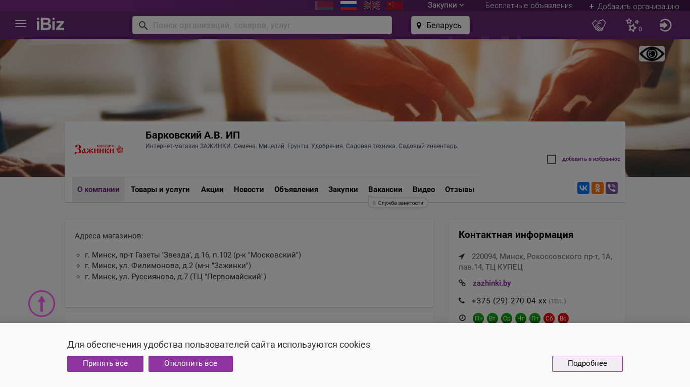| Название / Заголовок | Барковский А.В. ИП - Интернет-магазин ЗАЖИНКИ. Семена. Мицелий. Грунты. Удобрения. Садовая техника. Садовый инвентарь.. 220094, Минск, , Рокоссовского пр-т, 1А, пав.14, ТЦ КУПЕЦ |