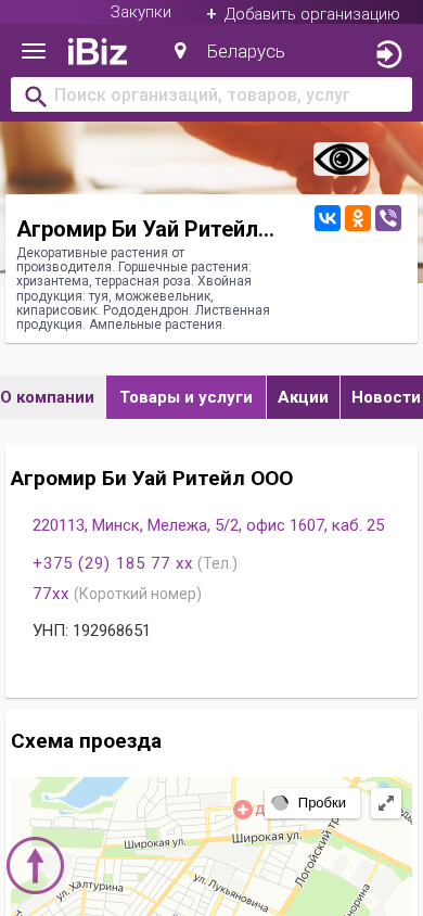 | AI-анализ | This online resource is a retail company named Агромир Би Уай Ритейл ООО, located in Minsk, Belarus at Мележа, 5/2, офис 1607, каб. 25. They specialize in the sale of decorative plants, both potted and non-potted, including chrysanthemums, terrace roses, coniferous plants such as juniper, pine, and cypress, rhododendron, and vine plants. The website also provides contact information, including a phone number and a map to help customers easily locate the company. The company's Unified State Register number is 192968651. The business hours are from 9:00 to 18:00, Monday through Friday, with weekends being a day off. The company is listed under the |
