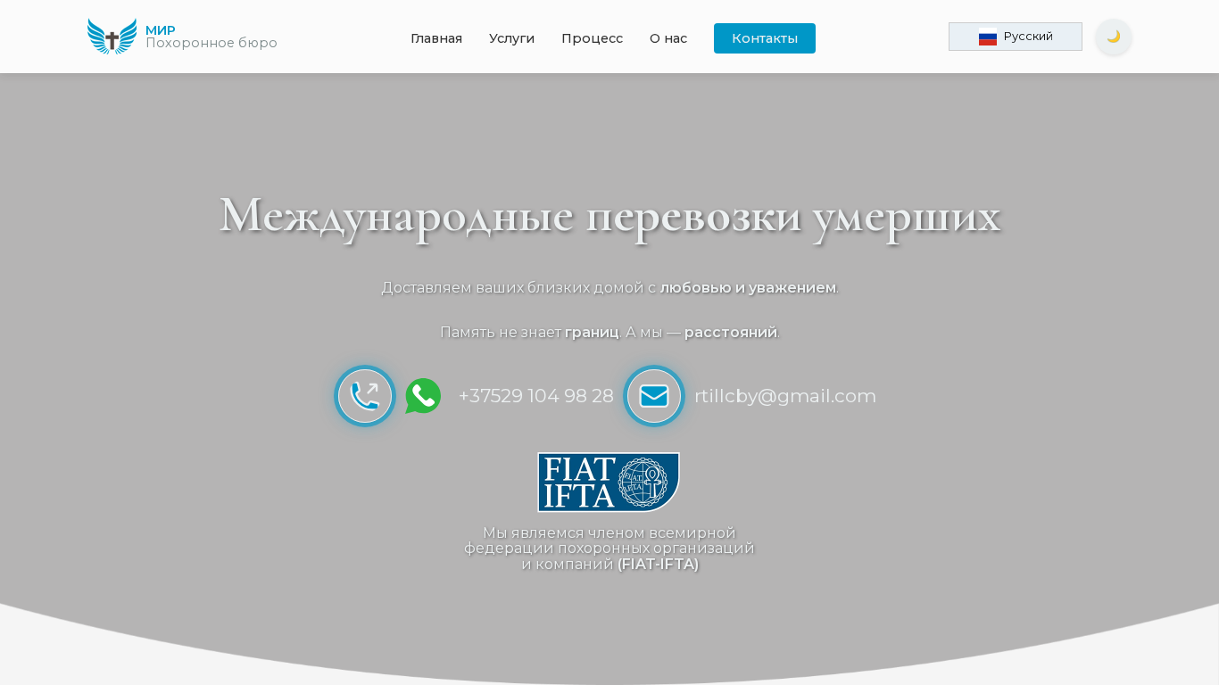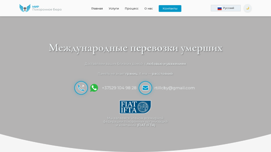 | AI-анализ | The website is a funeral bureau offering international transportation services for deceased individuals and their ashes to various cities in Belarus, CIS countries, and Europe. Mir Funeral Bureau provides a full range of services at affordable prices. The website is available in Russian, Polish, and English languages, and includes sections for services, process, about us, and contacts. The company is a member of the World Federation of Funeral Services and Companies (FIAT-IFTA). They offer comprehensive services for repatriation from Europe to Belarus, work with insurance companies, assist in document preparation, and provide safe transportation worldwide using various modes of transport. They also organize dignified farewells and handle all aspects of funeral arrangements. The website includes testimonials from satisfied clients. |