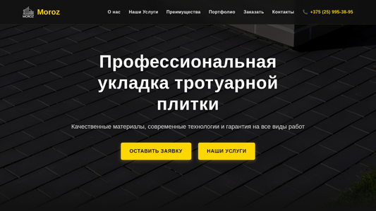 | AI-анализ | This online resource, titled "Moroz - Укладка тротуарной плитки," offers professional trotoar paving services. The website highlights the use of quality materials and a guarantee on all types of work. Keywords associated with the site include "trotoar paving," "paving stones," "concrete," "landscape design," and related terms. The company, Moroz, has been providing landscaping and roadwork services in Borisov and the Minsk region for ten years, catering to both commercial and government clients, and collaborating with major construction organizations. Services include comprehensive terrain improvement, road repairs, and the installation of trotoar paving and concrete. The company boasts a large pool of experienced personnel, advanced tools, and the ability to handle projects of all complexity levels and sizes. Moroz ensures high quality and adheres to deadlines with its extensive |