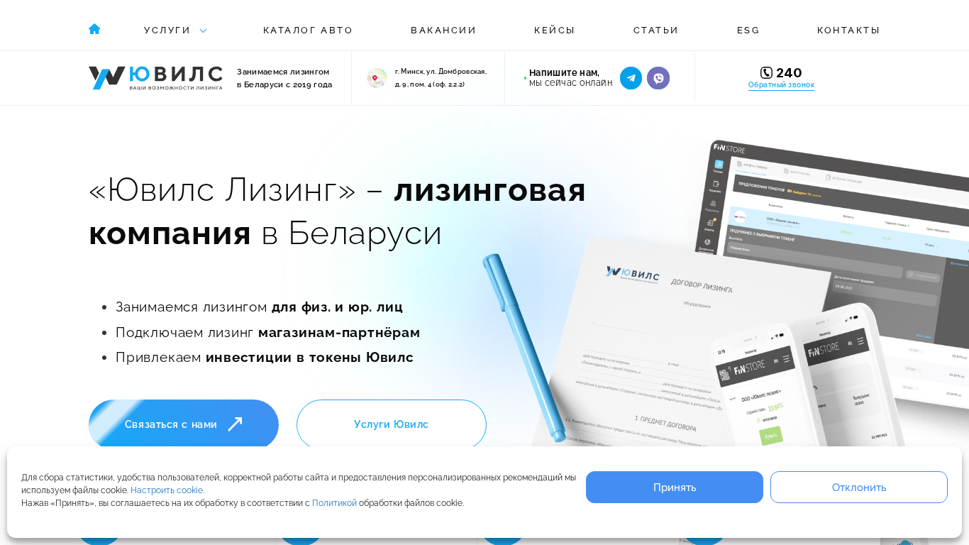 | SEO-описание | «Ювилс» – лизинговая компания в Минске и Беларуси ❱❱ Подключение партнёров ❱❱ Привлечение инвестиций ❱❱ Работаем с физ. и юр. лицами❗ |