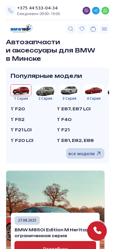 | AI-анализ | --- The website BMW139.by is an e-commerce platform selling auto parts and accessories for BMW vehicles. The website offers a part selection based on the original catalog ETK. The company behind the website is Aeronavto, located in Minsk, Belarus, and can be contacted via phone at +375 44 533-04-34 or through the provided address. Delivery is available within Minsk and Belarus, and payment can be made using a credit card or through the Yandex.Pay system. The website features a blog, customer support, and a catalog section with various BMW models and promotions. Popular BMW models listed on the website include the 1 Series, 2 Series, 3 Series, 4 Series, 5 Series, 6 Series, 7 Series, i Series, X1, X2, |