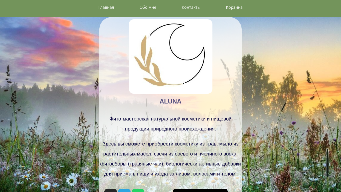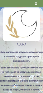 | AI-анализ | The web project "Aluna" is a phyto-workshop offering natural cosmetics and food products. The website offers various items including cosmetics made from herbs, soap made from plant oils, candles from soybean and beeswax, herbal teas, and biologically active additives for consumption and body care. Instagram, Telegram, and WhatsApp are provided as contact methods. The majority of cosmetics are made to order with a production time of 7-10 days, depending on component availability and current orders. Some items, such as soap and hydrolytes, are in stock. The catalog can be explored for product details. To make a purchase, customers can contact the seller via phone or social media. Payment can be made in cash or by bank card. Pickup is available at the workshop located in Minsk, or delivery can be arranged through Europochta |