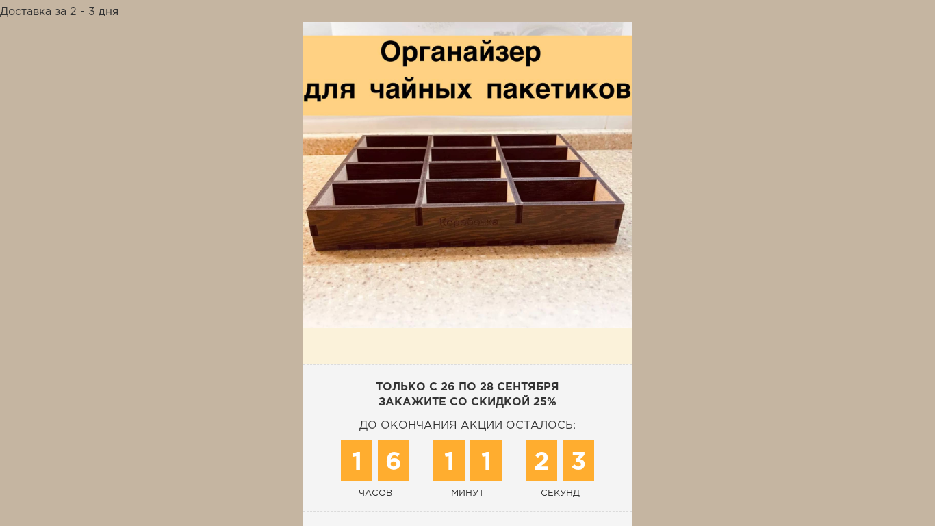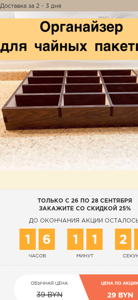 | AI-анализ | --- The website is for an organizer for tea packaging, offering delivery within 2-3 days. It is available for purchase only from September 26 to 28 with a 25% discount. The organizer, made of MDF material, is stylish and functional, suitable for various types of tea storage. It comes in various colors and textures to match different interiors. The organizer features natural materials, is universal, and requires no assembly. The site also offers testimonials from satisfied customers. Delivery and payment are handled in a three-step process: leaving a request on the site, operational shipping through Belposhta, and paying upon receipt. The site guarantees a high-quality product, with all items checked before shipment and sourced from trusted suppliers. Refunds are made in accordance with Belarusian laws and human relationships. The site also offers a pay-up |