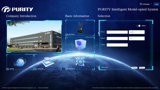 | AI-анализ | The portal Purity is an intelligent model-opted system company website, offering a selection of pump software for various types of pumps. The website provides tools for pump selection, calculation, and design. Keywords associated with the site include "pump selection software," "pump," "calculation," and "design," among others. Users can access information on various pump types such as pipeline circulation pumps, sewage pumps, end suction pumps, multistage pumps, centrifugal pumps, self-priming pumps, and double suction split case pumps. The site also includes a login feature and is available in Chinese, English, and Russian languages. The technical support for the website is provided by Shanghai EvenTech Fluid Technology Co. Ltd. The version of the website is 2.25.0915B. |