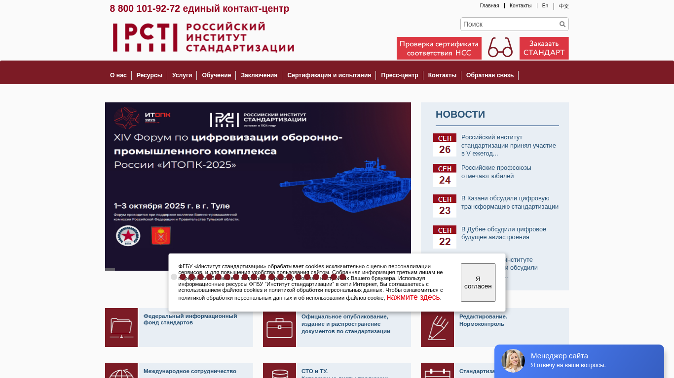 | AI-анализ | This online resource is the official website of the Federal State Budgetary Institution "Institute of Standardization" in Belarus. The website offers a wide range of information and services related to standardization and certification. Users can find news, historical information, organizational structure, and various informational materials on the site. The main sections include "About Us," which provides details on the institute's mission, vision, values, and leadership; "Information and Reference Materials," which offers a database of products from Russia and a purchasing center; and "Services," which covers areas such as occupational safety, data protection, and certification. The site also features a national system of certification, a collective use center for "Ecosystem of Standardization," and resources for normative and legal support. The website is available in English, Russian, and Chinese, and includes a contact panel and a section for the visually impaired. The top |