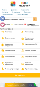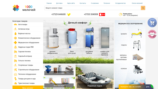 | AI-анализ | --- The web project "Магазин 1000 мелочей" offers home and cottage goods at affordable prices. The extensive inventory includes various items with discounts available. The main categories of products are automotive items, video recorders, water pumps, medical equipment, and children's toys and furniture. Some specific products include basketball hoops, inflatable pools, and various types of wheeled vehicles. The contact information for the company is provided, along with information about their working hours: 9:00 – 23:00 (every day). |