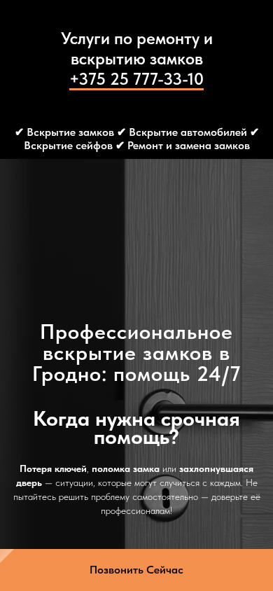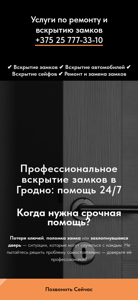 | SEO-описание | Мы — команда опытных мастеров-профессионалов, специализирующихся на экстренном вскрытии замков любой сложности. Наша миссия — быстро и безопасно помочь вам в самых сложных ситуациях, связанных с доступом к помещениям или транспортным средствам. Работаем в Гродно и области. |