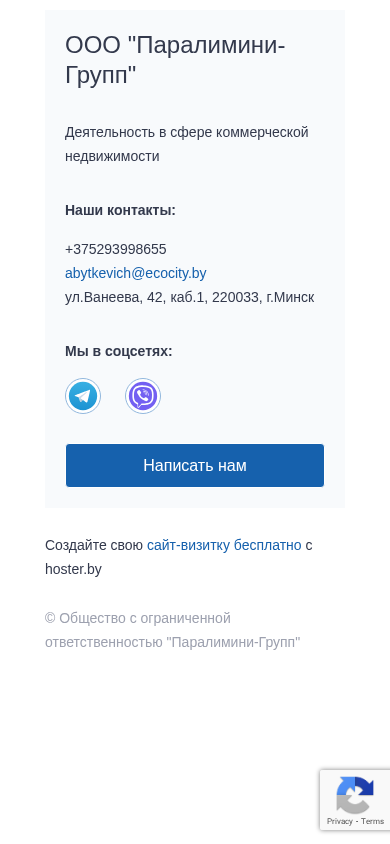 | AI-анализ | This website is for OOO "Паралимини-Гroupp," a Belarusian company operating in the commercial real estate sector. The homepage includes a contact section with the company's phone number, email address, and location in Minsk. Users can also find links to the company's social media profiles and an option to send a message. The top keywords for this site include "паралимини-групп," "проверьте," "корректность," "введ," "нного," "поля," "ооо," "сообщение," "деятельность," "коммерческой," and "недвижимости." The site design includes a form for users to submit a request, which requires filling out fields for their name, email, and message. The site is registered under the .BY top-level domain and is owned |