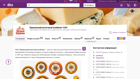 | AI-анализ | This online resource represents the official website of Pruzhansky Molochny Kombinat OAO, a dairy processing plant located in Pruzhany, Belarus. The website provides information on the company's hard and semi-hard cheeses, sweet cream butter, and chocolate milk powder. Visitors can find the company's address, which is 224145, Pruzhany, Gorina-Kolody, 26. Additionally, the website includes sections for company news, job opportunities, and contact information for two retail stores: "Vera's" on ul. Gorina-Kolody, 26, and "Vera's" and Cafeтериy on ul. Poleskaya, 5. The plant also produces other dairy items such as milk, condensed milk, and butter oil. The website's structure |