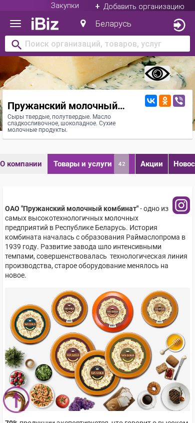 | Название / Заголовок | Пружанский молочный комбинат ОАО - Сыры твердые, полутвердые. Масло сладкосливочное, шоколадное. Сухие молочные продукты.. 224145, Пружаны, , Горина-Коляды, 26 |