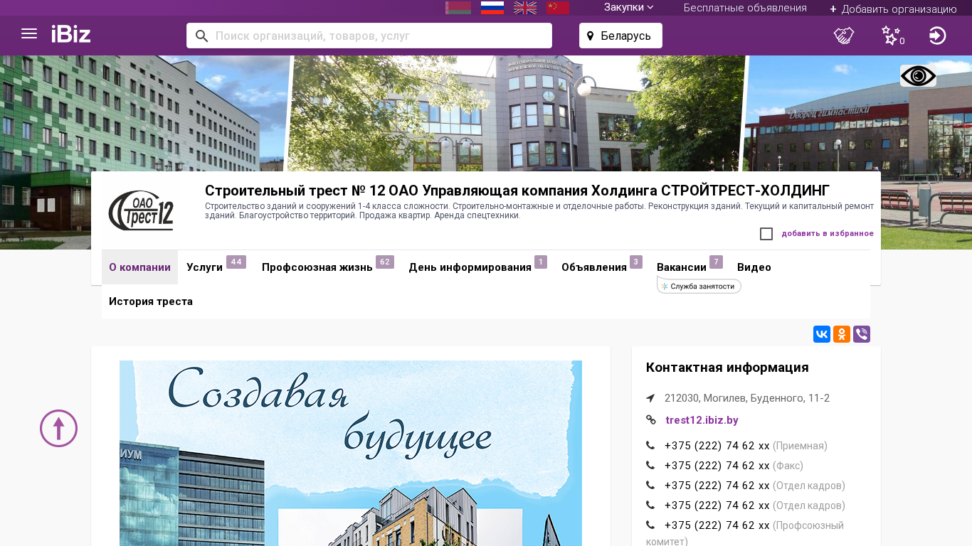 | Название / Заголовок | Строительный трест № 12 ОАО Управляющая компания Холдинга СТРОЙТРЕСТ-ХОЛДИНГ - Строительство зданий и сооружений 1-4 класса сложности. Строительно-монтажные и отделочные работы. Реконструкция зданий. Текущий и капитальный ремонт зданий. Благоустройство территорий. Продажа квартир. Аренда спецтехники.. 212030, Могилев, , Буденного, 11-2 |