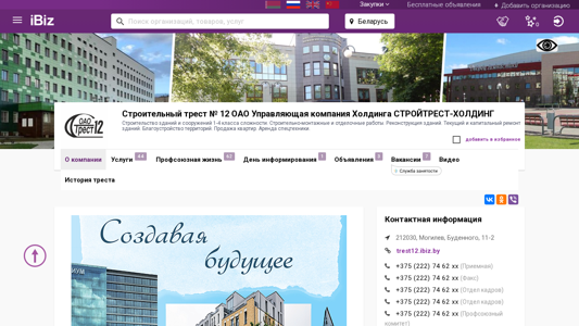 | AI-анализ | The web project "Stoiтельnyy trest № 12 OAO Upravlyayushchaia kompaniya Stroistrest-Holding" is a construction company offering services for the construction, repair, and renovation of buildings and structures with a complexity level ranging from 1 to 4. The company provides building and installation works, as well as finishing and interior design services. It specializes in the reconstruction of buildings, both current and major repairs, and the improvement of territories. The company also deals with the sale of apartments and the rental of special equipment. The organization is located in Mogilev, Belarus, at the address: 212030, Lenina str., Budenogo, 11-2. The website includes various sections with information about the company's services, history, and contacts. It also features a section for free classified |