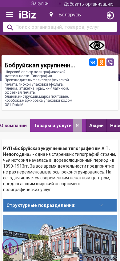 | Название / Заголовок | Бобруйская укрупненная типография им. А.Т. Непогодина РУП - Широкий спектр полиграфической деятельности. Типография. Производитель флексографической печати, гибкой упаковки (фольга, пленка, этикетка, крышки-платинки), офсетная печать, бланки,инструкции,марки почтовые, коробоки,маркировка упаковки кодом GS1 DataM. 213826, Бобруйск, , Социалистическая, 103 |