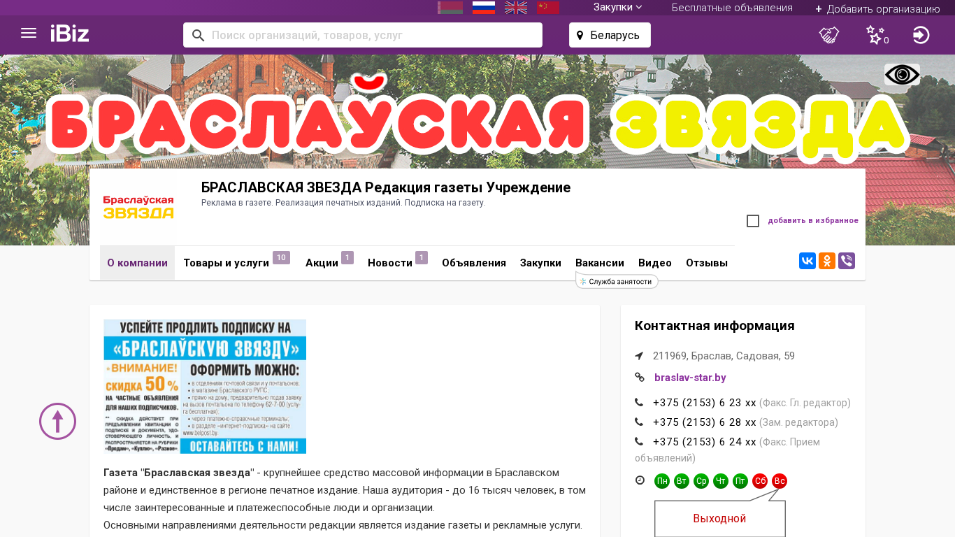 | Название / Заголовок | БРАСЛАВСКАЯ ЗВЕЗДА Редакция газеты Учреждение - Реклама в газете. Реализация печатных изданий. Подписка на газету.. 211969, Браслав, Садовая, 59 |