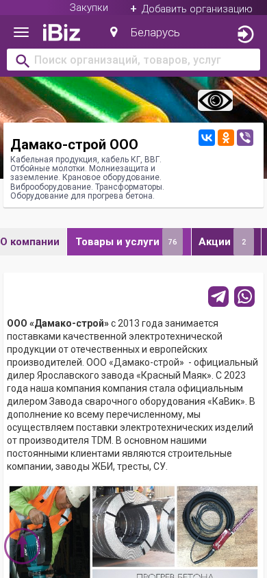 | Название / Заголовок | Дамако-строй ООО - Кабельная продукция, кабель КГ, ВВГ. Отбойные молотки. Молниезащита и заземление. Крановое оборудование. Виброоборудование. Трансформаторы. Оборудование для прогрева бетона.. 220116, Минск, , Алибегова, 12, пом. 3Н |