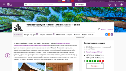 | Название / Заголовок | Остановочный пункт вблизи пос. Майск Брагинского района - Охотничий комплекс. Проведение свадеб, банкетов, торжественных мероприятий.. 247650, , Остановочный пункт пос. Майск |