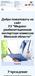 | AI-анализ | This online resource is the official website for the "Медико-реабилитационная экспертная комиссия Минской области" (MREC), a medical rehabilitation institution in Belarus. The title is "Главная" (Main). The description is blank. The top keywords include Belarusian words for "medical", "rehabilitation", "expert commission", "Minsk region", and phone numbers. The top words are various ethnicities and languages. The working hours are 8:00 to 17:00, with lunch from 13:00 to 14:00. Patients are received from 8:00 to 12:00 and from 12:20 to 15:00. The language options include Belarusian and several ethnic languages. The contact |