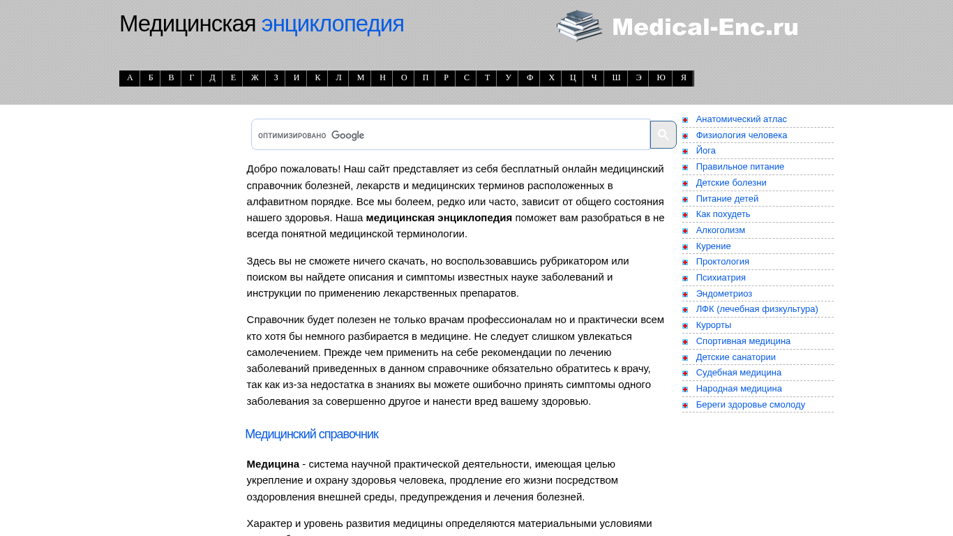 | SEO-описание | Подробный медицинский справочник-энциклопедия. Медицинская терминология, определение симптомов заболеваний, классификация лекарств |