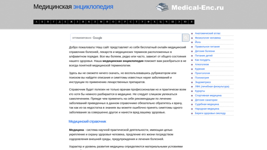 | AI-анализ | The portal is a free online medical encyclopedia and reference book containing information on diseases, medications, and medical terms arranged in alphabetical order. Despite our good or bad health, we all get sick at some point. Our medical encyclopedia will help you understand the often confusing medical terminology. Here, you won't be able to download anything, but using the table of contents or search function, you will find descriptions and symptoms of known diseases and instructions for using medication. This encyclopedia is not only useful for medical professionals but also for anyone with a basic understanding of medicine. It is important not to engage in self-medication. Before applying the recommended treatments for conditions mentioned in this encyclopaedia, consult a doctor, as misdiagnosis based on insufficient knowledge could harm your health. The medical encyclopedia is a scientific practical activity aimed at maintaining and protecting human health, extending life |