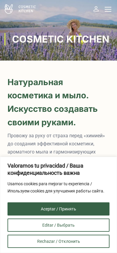| AI-анализ | language: ru This website, titled "Обучение мыло- и кремоварению - Школа Cosmetic Kitchen," offers online courses for soap and cream making to learn a new hobby or profession within a few weeks. The description starts with "Курсы мыловарения и кремоварения онлайн" and invites users to begin with free lessons. The site uses cookies for site improvement and functionality, including recording user progress in courses and remembering preferences. Cookies last from one hour to one year. The site also uses cookies from Stripe for fraud prevention purposes. Functional cookies help perform certain site features, such as sharing content on social media platforms. The domain is cosmetickitchen.pro and the language is Russian. |