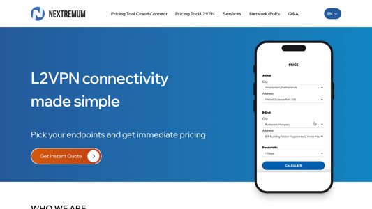 | AI-анализ | This online resource, titled "Ethernet Private Lines & L2VPN Connectivity | Instant Quote, 2 business Days Deployment," offers Ethernet Private Lines and Layer 2 Virtual Private Network (L2VPN) connectivity solutions with instant pricing and a quick two-business-day deployment. The website is operated by Nextremum, a modern technology-driven telecom operator, aiming to provide scalable, carrier-grade networks in Europe and Asia through innovative MPLS L2VPN connectivity solutions. The platform features a cloud-based pricing tool for customers to easily select their endpoints and receive immediate pricing. The website also includes a Q&A section for inquiries about L2VPN services, network/PoPs, and other related topics. Nextremum prides itself on fast activation, with services up and running in just two business days, and real engineer |