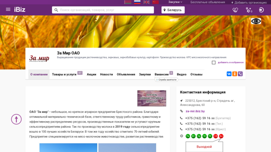| Название / Заголовок | За Мир ОАО - Выращивание продукции растениеводства, зерновых, зернобобовых культур, картофеля. Производство молока. КРС мясо-молочного направления.. 225012, , Страдечь аг., Александрова, 60 |