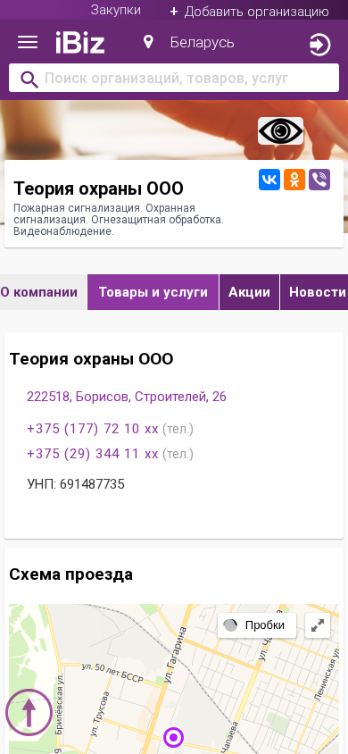 | AI-анализ | The website is for the Belarusian company "Teoria Ohrany OOO" located at Строителей, 26 in Borisov, Minsk region, offering services related to fire alarm systems, security systems, and fireproof treatments, as well as video surveillance. The contact information includes two phone numbers: +375 (177) 72 10 xx and +375 (29) 344 11 xx. The company's UNP (Unified State Register of Legal Entities) number is 691487735. The opening hours are from 9:00 to 18:00, Monday to Friday, with no breaks for lunch. The website also includes a map and contact information for reaching the company. |