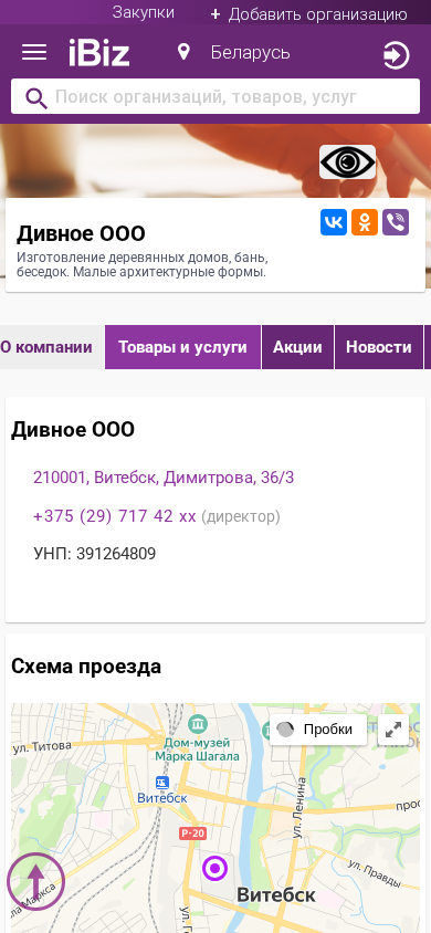 | AI-анализ | This online resource is a company website for Divnoe OOO, a manufacturer of wooden houses, saunas, and gazebos located in Vitsebsk, Belarus. The company's address is listed as 210001, Dimitrova Street, 36/3. The website provides contact information, including a phone number, +375 (29) 717 42 xx (director), and the Unified State Register of Enterprises number, 391264809. The site offers information on the company's products and services, including wooden houses, log cabins, and saunas, as well as contact details for the company's director, Ivaniski Sergei Sergeevich. The website is also listed in the business categories of "Wooden houses, log cabins, and saunas |