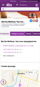 | AI-анализ | This website is for VitAn Mebel, a private business specializing in kitchens with built-in appliances, wardrobes, cabinets for living rooms and dining rooms, and children's furniture. The company is located in Vitsebsk, Belarus, at Строителей пр-т, 2, 2nd floor. Contact information, including phone numbers, is provided. The website also includes a map for directions and business hours, which are Monday through Friday from 11:00 AM to 6:00 PM without lunch. The company's UNP number is 390496193. |