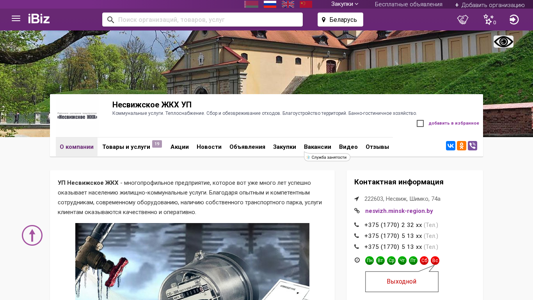 | AI-анализ | This website is for Nesvizhское ЖКХ УП, a multi-profile organization that has been providing residential and communal services to the population for many years. With experienced and competent staff, modern equipment, and a fleet of vehicles, the company ensures high-quality and timely service delivery. Services include heating, waste disposal and neutralization, transportation, electrical services, sanitation, construction and repair works, landscaping, and garbage collection, among others. By partnering with Nesvizhское ЖКХ УП, clients can benefit from a wide range of services while ensuring a reputable service provider. The website includes a map for directions, contact information, and details on the company's services and offerings. |