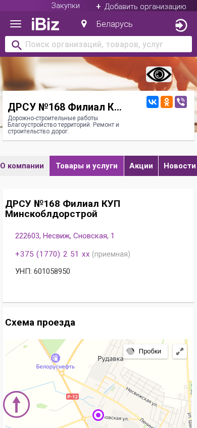 | Название / Заголовок | ДРСУ №168 Филиал КУП Минскоблдорстрой - Дорожно-строительные работы. Благоустройство территорий. Ремонт и строительство дорог.. 222603, Несвиж, , Сновская, 1 |