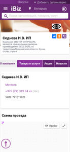 | AI-анализ | This online resource is a website for Sedneva I.V. IP - Master Interier, an official dealer of Geos Ideal in the Mogilev region. The website offers kitchens, tables, and chairs for sale. The website includes information on how to contact the company, its location, and its opening hours. The company is located in Mogilev, Belarus, and its phone number is +375 (29) 349 64 xx. The company's Unified State Registration number is 791011621. The website also features a map for directions and information on the company's opening hours, which are Monday to Saturday from 10:00 to 19:00, except for Sunday when the hours are 10:00 to 17:00. The company does not serve meals |