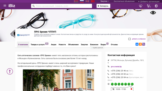 | Название / Заголовок | ПРО Зрение ЧТПУП - Подбор, изготовление и ремонт очков. Контактные линзы и средства по уходу за ними. Консультация врачей-офтальмологов. Диагностика и коррекция зрения. Детская офтальмология.. 247760, Мозырь, , Бульвар Дружбы, 18/3, 9 |