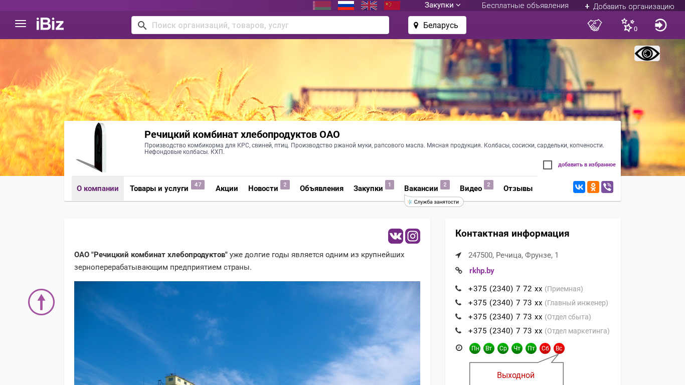 | Название / Заголовок | Речицкий комбинат хлебопродуктов ОАО - Производство комбикорма для КРС, свиней, птиц. Производство ржаной муки, рапсового масла. Мясная продукция. Колбасы, сосиски, сардельки, копчености. Нефондовые колбасы. КХП.. 247500, Речица, , Фрунзе, 1 |
