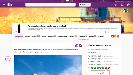 | AI-анализ | The portal Rechiцкий комбинат хлебопродуктов OAO is a leading grain processing company in Belarus, specializing in the production of feedstock for livestock, pigs, and birds, as well as rye flour and rapeseed oil. The company also produces meat and meat products such as sausages, hot dogs, fish sticks, and smoked products. The business offers neufunded sausages and operates a milling plant. The organization's address and contact details are provided. |