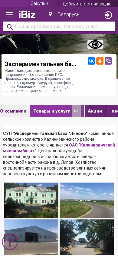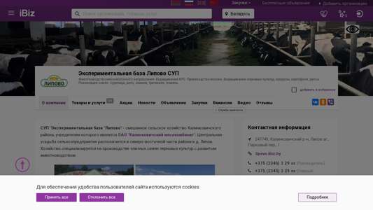 | Название / Заголовок | Экспериментальная база Липово СУП - Животноводство мясо-молочного направления. Выращивание КРС. Производство молока. Выращивание зерновых культур, кукурузы, картофеля, рапса. Реализация семян: сурепица, рапс, озимое, тритикале, ячмень.. 247749, , Липов аг., Парковый пер., 1 |