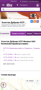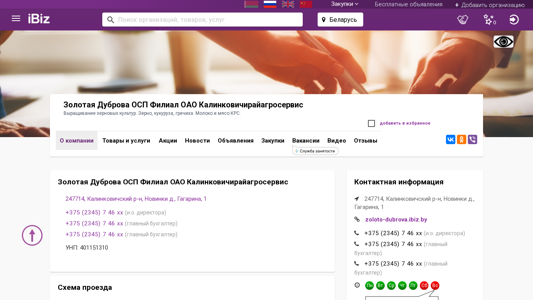 | AI-анализ | The website is for Zolotaia Dubova OSP Filial OAO Kalinkovichraiaservis, a branch of a farm services company specializing in the cultivation of grain, corn, and soybeans, as well as dairy and meat production from cattle. The site includes a map for directions, contact numbers, and the company's address located in the Kalinkovich district of Belarus. The top menu offers sections for 'Companies', 'Goods and Services', 'News', 'Announcements', 'Vacancies', 'Videos', 'Reviews', and 'Contacts'. Additionally, there are sections for 'About the Company', 'Products and Services', 'News', 'Announcements', 'Vacancies', 'Videos', and 'Reviews' in the main content area. The company's UNP number is provided. |