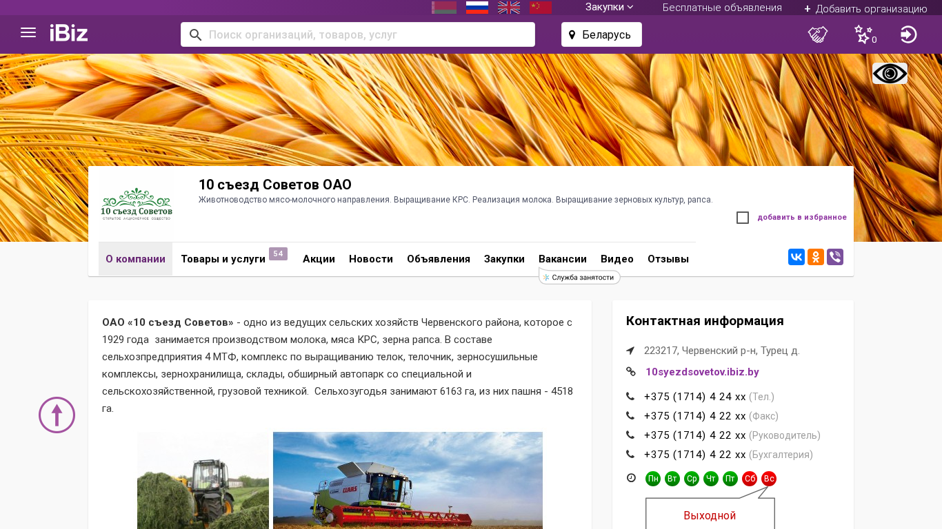 | Название / Заголовок | 10 съезд Советов ОАО - Животноводство мясо-молочного направления. Выращивание КРС. Реализация молока. Выращивание зерновых культур, рапса.. 223217, , Турец д. |