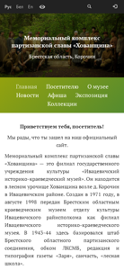 | AI-анализ | This online resource is the official website for the Memorial Complex of Partisan Glory 'Hovanschina'. It provides news and event listings, information for visitors, prices, exhibition details, collections, and materials for museum professionals. The complex is a branch of the State Cultural Institution 'Ivacevich Historical and Local Lore Museum', located in the forested area of Hovanschina near the village of Korochin in Ivacevich District. Established in 1971, it was transferred to the Brest Regional Museum in 1998 as a branch of the Ivacevich Historical and Local Lore Museum. During 1943-44, this site served as the headquarters for the Brest Oblast Partisan Detachment, the obkom of the Komsomol, the editorial and printing offices of the 'Zarya' newspaper, |