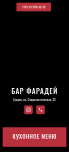 | AI-анализ | The portal is a website for Bar Faraday, a bar located in Grodno, Belarus, at ul. Sociallyistcheskaya 32. It provides information about the bar's menu, which includes both regular and kitchen menus, as well as cocktails and bar menus. The contact information for the bar is also provided, including its phone number (+375 33 359-32-32) and address. The bar's hours of operation are indicated as well: it is open from 18:00 to 02:00 on weekdays and from 18:00 to 05:00 on weekends. |