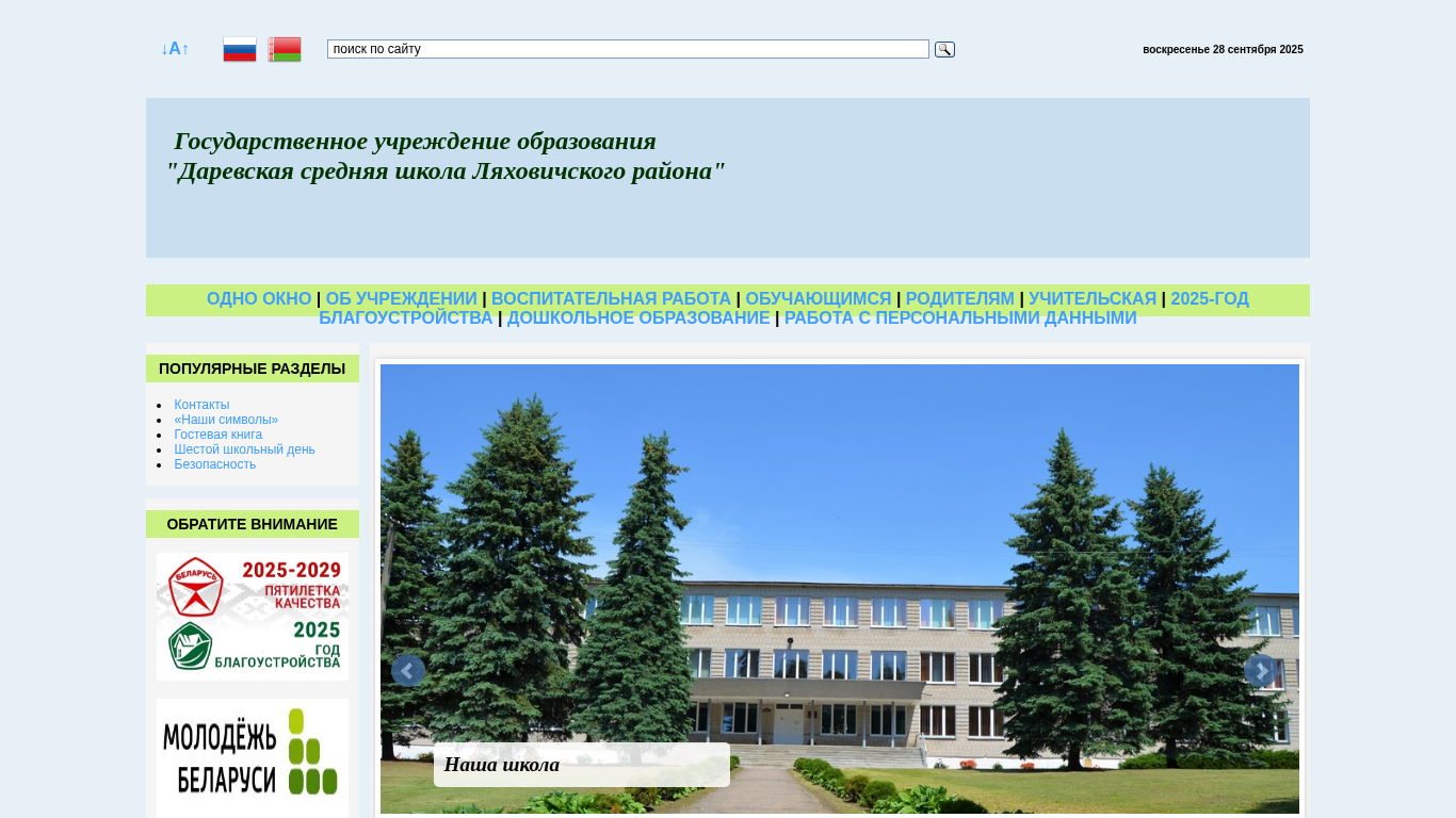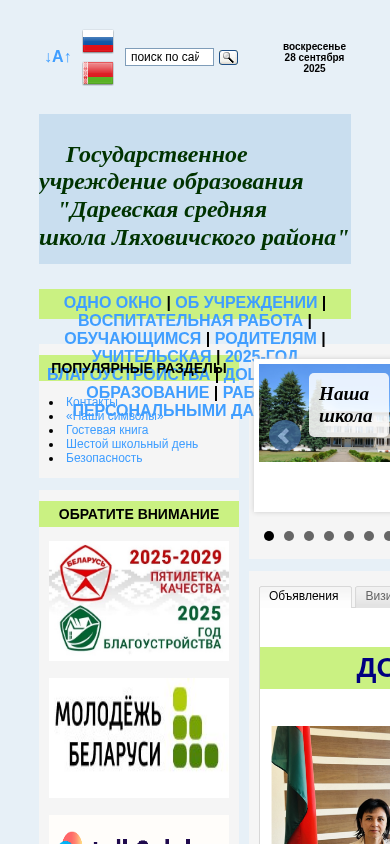 AI-анализ | --- This website is for the state educational institution "Darevo Middle School" located in Liahoвичский region, Belarus. The title of the website is "© Даревский УПК дс-СШ" and the description includes keywords related to education, news, and the Liahoвичsky region of Belarus. Popular topics on the site include information about the school, its educational work, students, parents, and teachers. The website also includes sections on the Year of Improvement in 2025, kindergarten education, and working with personal data. The site is user-friendly and allows users to adjust the font size using their browser. Additional information can be found at https://support.google.com/chrome/answer/96810?hl=ru. The website includes sections for announcements, a school visa, a safe route map, and a contact page |
