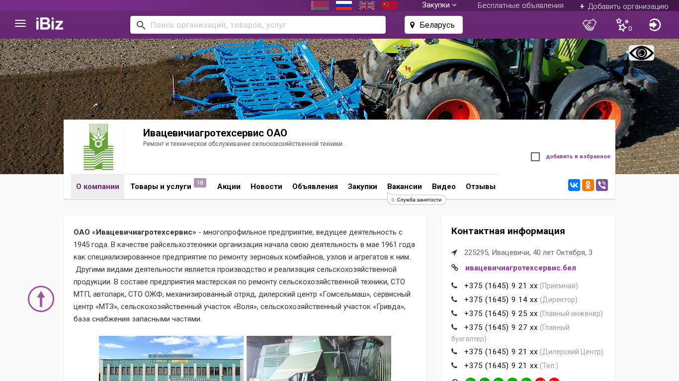 | AI-анализ | The website is for Ивацевичиагротехсервис ОАО, a Belarusian company based in Ивацевичи that offers repair and maintenance services for agricultural machinery. Established in 1945, the company began as a specialized repair shop for grain combines and their components. It now also produces and sells agricultural products and provides services such as tractor repair, livestock farm equipment maintenance, conditioner refilling for agricultural machinery and vehicles, car and crane rental, and land cultivation. The company operates a workshop for agricultural machinery repair, an MTP repair station, an auto park, an OZHF repair station, a mechanized field unit, a dealer center for Gomselmash, a service center for Minsk Tractor Factory, a farmland area 'Воля', and a farmland area 'Гривда'. The |