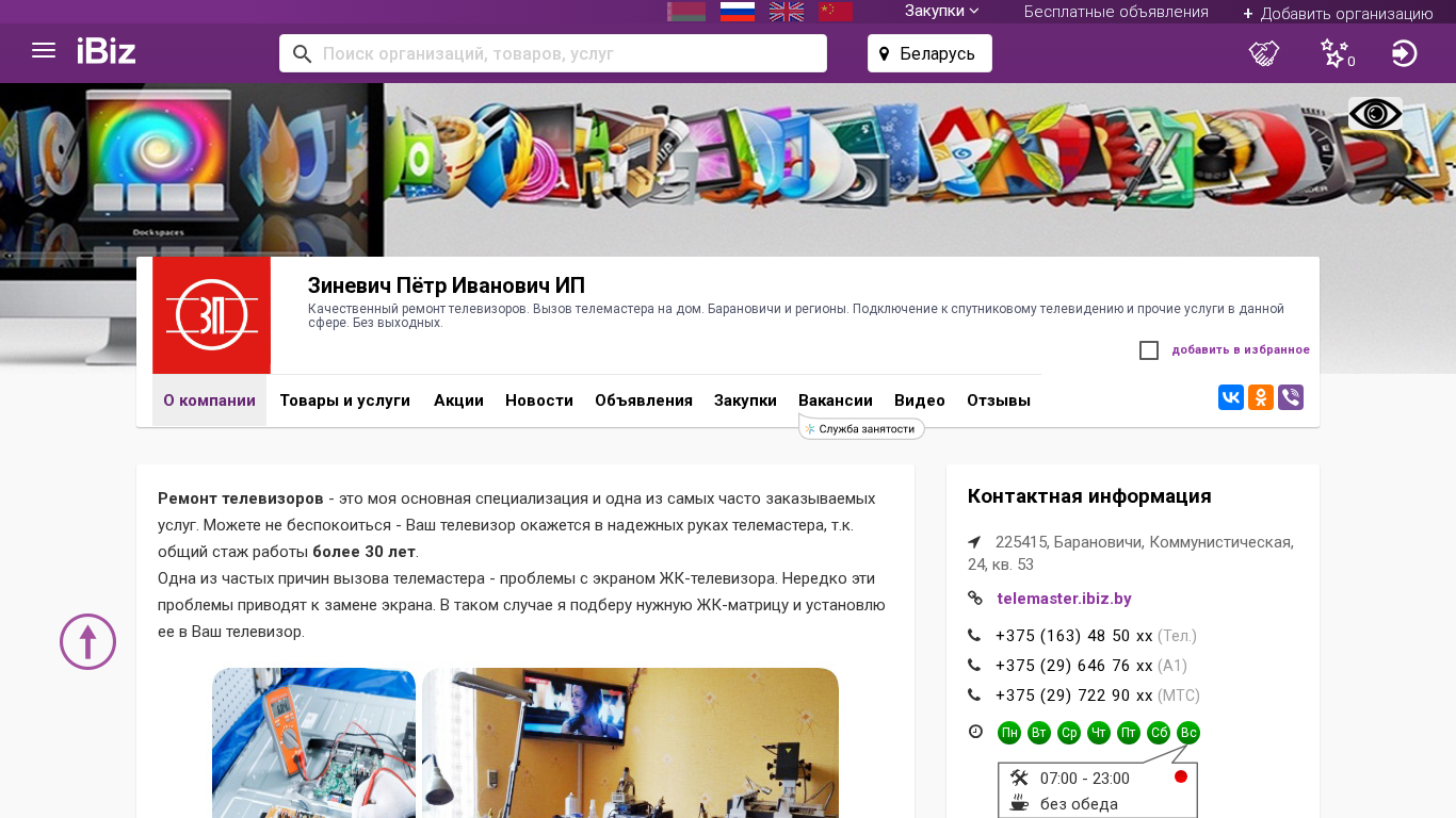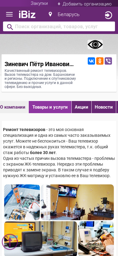 | AI-анализ | --- This website is for a television repair and installation service based in Baranovichy, Belarus. The company, Zinevich Petr Ivanovich IP, offers high-quality repair services for televisions, including the dispatch of a technician to customers' homes. They also provide connections to satellite television and other related services in the region. The business operates without weekends. Additional information such as the company's address, contact phone numbers, and a map for directions can be found on the website. The website also includes sections for company information, products and services, news, classified ads for purchases, vacancies, videos, and customer reviews on social media platforms Vkontakte and Odnoklassniki. The main services provided are repair and maintenance of televisions, with a focus on LCD screen issues, which often result in screen replacements. Other services include diagnosis of television problems, installation of |