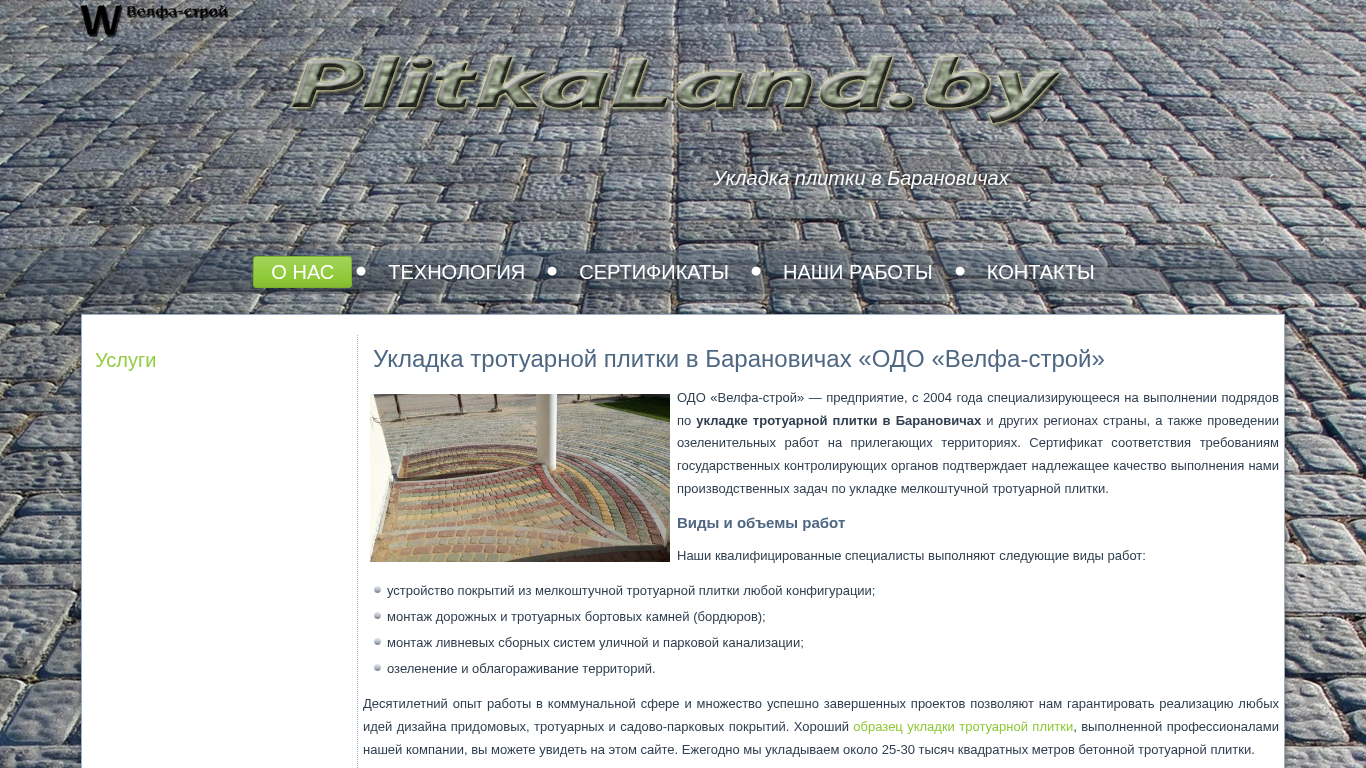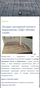 | SEO-описание | ОДО «Велфа-строй» - предприятие, с 2004 года специализирующееся на выполнении подрядов по укладке тротуарной плитки в Барановичах и других регионах страны |