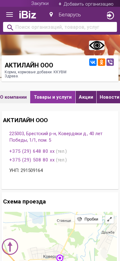 | Название / Заголовок | АКТИЛАЙН ООО - Корма, кормовые добавки. ККУВМ Здрава.. 225003, , Ковердяки д., 40 лет Победы, 1/1, пом. 5 |