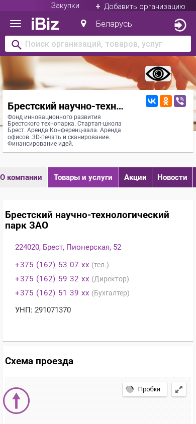 | AI-анализ | This online resource is the official website of the Brest Technological Park Foundation for Innovative Development of Brest Technopark. It provides information on the Startup School Brest, conference hall and office rentals, 3D printing and scanning services, and funding for ideas. The site also features a map for directions, contact information, and operating hours. The company is located in Brest, Belarus, at the address Пионерская, 52. The phone numbers for the director, director, and accountant are provided. The website is in the .BY domain and has a Unified State Register number of 291071370. The site is open for business Monday to Friday from 8:30 AM to 5:30 PM, with a lunch break from 12:00 PM to 1:00 PM. The site is categorized under Cent |