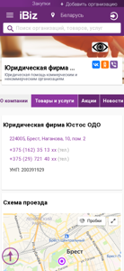 | AI-анализ | The website is for the legal firm "Юстис ОДО" located in Brest, Belarus, at the address Наганова, 10, пом. 2. The firm offers legal assistance to both commercial and non-commercial organizations. The website includes contact information for the firm, with phone numbers listed as +375 (162) 35 13 xx and +375 (29) 721 40 xx. The firm's UNP number is 200391929. The website also provides a map for visitors to help them find the location. The business hours are Monday to Friday from 9:00 to 18:00, with no breaks for lunch. The website falls under the categories of "Юридические услуги" (legal services) and "Юри |