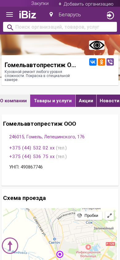 | AI-анализ | The website is for a company named Гомельавтопрестиж OOO, located in Гомель, Belarus, at the address Лепешинского, 176. The company offers car body repair of any complexity level and car painting in a special chamber. The website provides contact information with two phone numbers: +375 (44) 532 02 xx and +375 (44) 536 75 xx. The company's UNP number is 490867746. The website also includes a map with directions, business hours from Monday to Saturday, and a rating system for users to leave feedback. The company is listed in the categories of "Auto service and repair" and "Auto service and repair in Гомеле". |