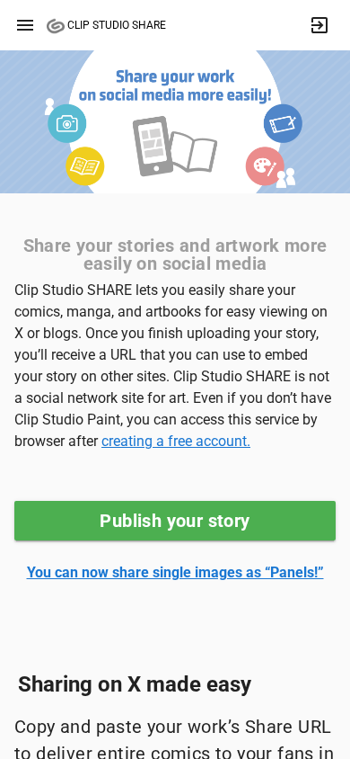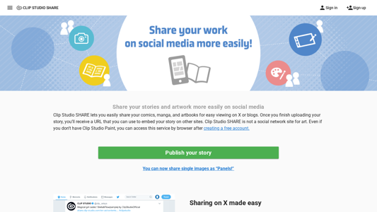 | AI-анализ | This online resource, titled CLIP STUDIO SHARE, offers a platform for users to publish and share their comics, illustrations, and other artwork in an online reader format. The service allows users to easily upload their work and receive a URL to embed it on social media or blogs. CLIP STUDIO SHARE is not a social network site, but rather a tool for sharing artwork in a user-friendly format. Users can publish single images as "Panels!" or share multi-page works, including comics and photo albums. The viewer supports both horizontal and vertical reading, allowing users to choose the best way to showcase their work. The service is accessible via browser after creating a free account, even without Clip Studio Paint. Users can also bind their stories digitally with a 3D viewer and choose the reading direction that works best for their story. Comments and story descriptions are automatically translated into other |